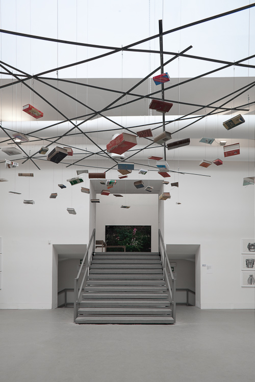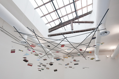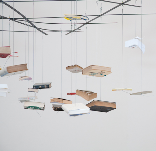 Richard Wentworth: Untitled. 2009 Installation, books, iron and steel cable (hanging books)