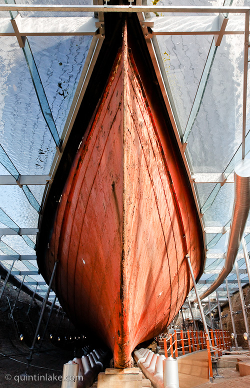 By 1998, an extensive survey discovered that the hull was continuing to corrode in the humid atmosphere of the dock and estimates gave her 20 years before she corroded away. Extensive conservation work began which culminated in the installation of a glass plate across the dry dock at the level of her water line, with two dehumidifiers, keeping the space beneath at 22% relative humidity, sufficiently dry to preserve the surviving material of the hull. This was completed, the ship was “re-launched” in July 2005, and visitor access to the dry dock was restored.