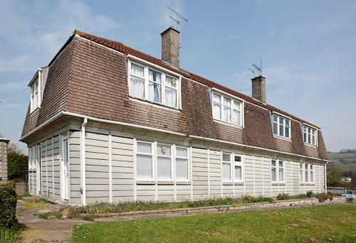 Semi-detached concrete prefabricated house with tiled mansard roof in Weston, Near Bath