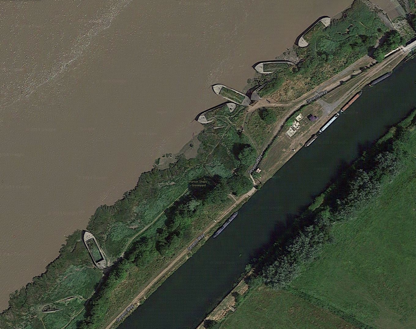 In the early 20th century, a number of old vessels were run aground along the bank of the Severn, near Purton, to create a makeshift tidal erosion barrier to reinforce the narrow strip of land between the river and Sharpness to Gloucester canal. Barges, Trows and Schooners were “hulked” at high tide, and have since filled with silt. More boats have been added, including the schooner “Katherine Ellen” which was impounded in 1921 for running guns to the IRA, the Kennet Canal barge “Harriett”, and Ferrous Concrete Barges built in World War II.