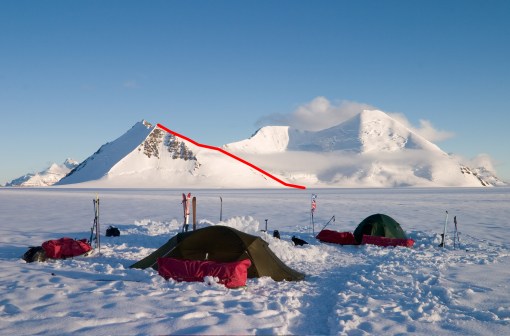 British Camp 8 at the southern end of the White Bird Glacier. The route up An Stuc (ca 2,190m) is marked. The large snowy peak to the right is the Big White Pyramid (ca 2,250–2,500m), attempted to 100m of the summit by Engel and Spencer (see AAJ 2007).