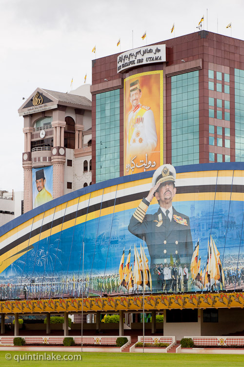 Propaganda images of Hassanal Bolkiah, the Sultan of Brunei, atop the Parade ground & surrounding buildings, Bandar Seri Begawan, Brunei