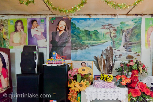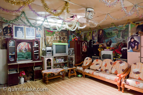 Plastic flowers, Western and Bollywood posters, televisions and loudspeakers decorate the sitting room in an Iban longhouse
