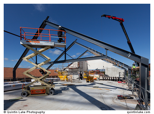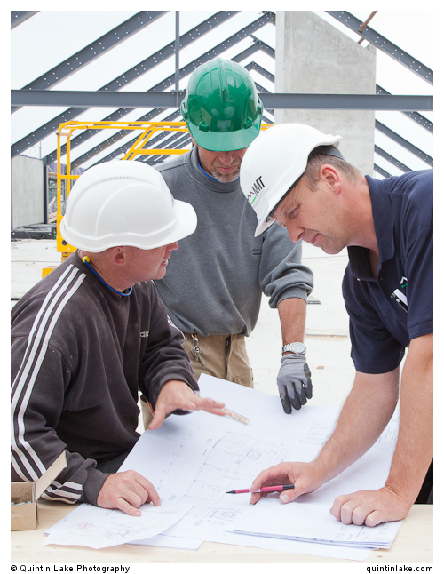Contractors discussing fabrication of the roof steelwork, June 2011