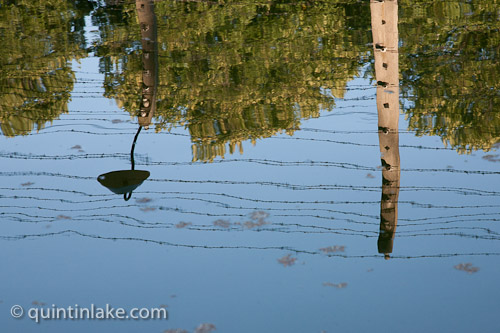 Electrified barbed wire fence and security light reflected in the surface of the Water reservoir / Swimming pool reserved for the SS at Auschwitz I Extermination Camp. The thought of the guards swimming about and taking their recreation as a break between executions is almost incomprehensible. Photo: Quintin Lake