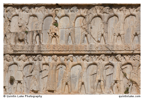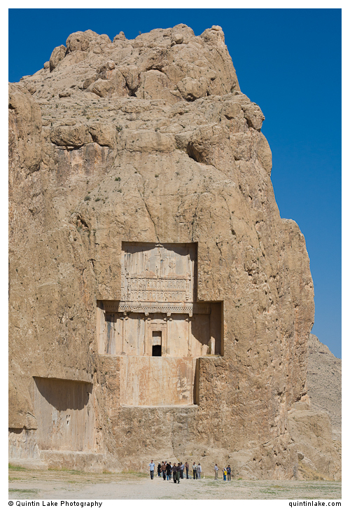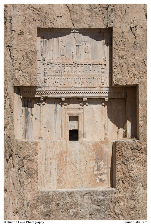 Achaemenid Tombs at Naqsh-e Rustam, also referred to as the Necropolis of the Persian crosses. The four tombs belonging to the Achaemenid kings are carved out of the rock face with the entrance to each tomb at the center of each cross, this opens onto to a small chamber, where the king lay in a sarcophagus. The horizontal beam of each of the tomb’s facades is believed to be a replica of the entrance of the palace at Persepolis. One of the tombs is that of Darius I the Great (c. 522-486 BC). The other three tombs are believed to be those of Xerxes I (c. 486-465 BC), Artaxerxes I (c. 465-424 BC), and Darius II (c. 423-404 BC) respectively.