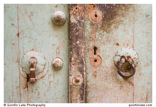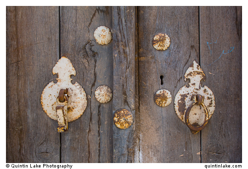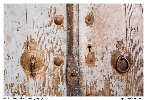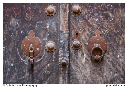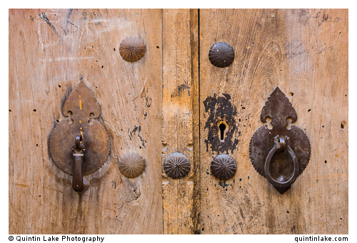 His and hers door knockers, Yazd, Iran. The masculine door knocker is rigid and heavy that makes a strong sound. People inside the house wil be informed that a man is behind the door. The feminine door knocker is curly and ring like and makes a lighter sound. It informs the people inside the house that a woman is behind the door. This system is in place due to the Islamic custom that women should be private from men except their intimate ones.