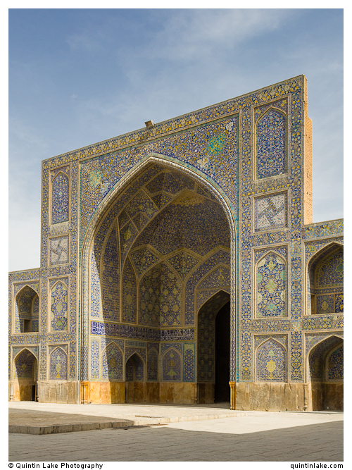 Built during the Safavid period between 1611 to 1629 by architect Shaykh Baha, the Imam Mosque of Isfahan it is an excellent example of Islamic architecture of Iran, and regarded as one of the masterpieces of Persian Architecture. It is registered, along with the Naghsh-i Jahan Square, as a UNESCO World Heritage Site. Although the Imam mosque is massive and initially impressive, in my view the neighbouring Sheikh Lotf Allah Mosque and the Jameh Mosque of Isfahan are of greater scuptural subtlety and sublime geometrical beauty.