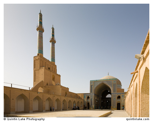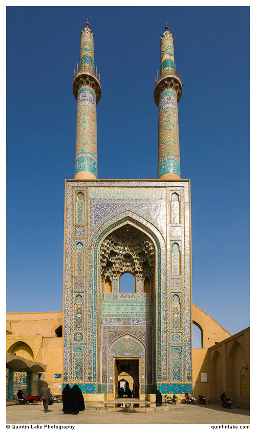 The Jameh Mosque of Yazd (Persian: Masjid-e-JÄmeh Yazd) is the grand, congregational mosque (JÄmeh) of Yazd, Iran. Built 12-14th Century. The grand iwan of the mosque is crowned by a pair of minarets, the highest in Iran, and the portal’s facade is decorated from top to bottom in dazzling tile work, predominantly blue in colour.