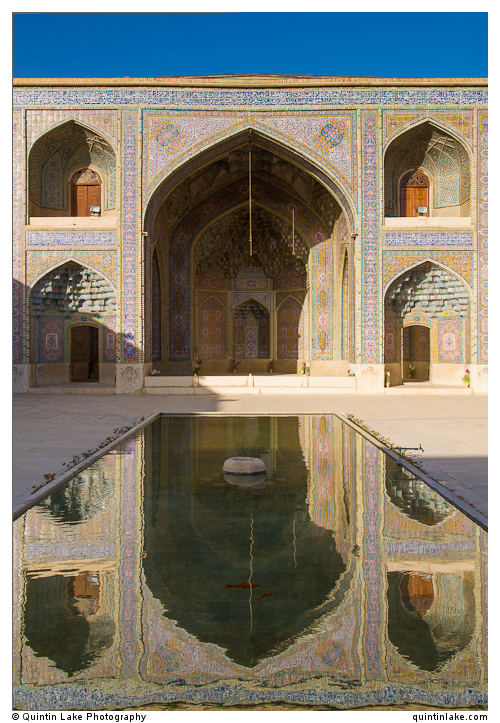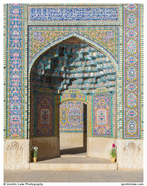 Nasir al-Mulk Mosque, (aka the Pink Mosque) Shiraz, Iran is unique and delightful for the widespread use of pink tiling in the decoration. Built 1876 -1888. Architects: Muhammad Hasan-e-Memar and Muhammad Reza Kashi Paz-e-Shirazi.