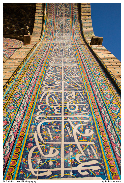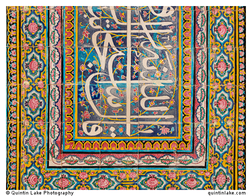 Glazed tile Inscription dating from the 19th century in the northern iwan (semiopen.space on the edge of a courtyard wall), Nasir-al-Mulk Mosque. Flexible timber, visible poking out of the wall at the top of the image, is used for earthquake resistance. The text is from Al Imran, the 3rd chapter of the Koran