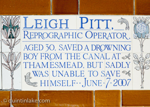 the most recent 2009 tile by Craven Dunnill Jackfield Ltd "Leigh Pitt Reprographic operator Aged 30, saved a drowning boy from the canal at Thamesmead, but sadly was unable to save himself" (Photo: Quintin Lake)