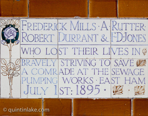 1902 tile by Royal Doulton "Frederick Mills · A Rutter Robert Durant & F D Jones Who lost their lives in bravely striving to save a comrade at the Sewage Pumping Works East Ham July 1st 1895" (Photo: Quintin Lake)