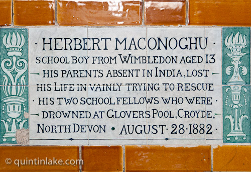 1931 tile by Fred Passenger "Herbert Maconoghu School boy from Wimbledon aged 13 His parents absent in India, lost his life in vainly trying to rescue his two school fellows who were drowned at Glovers Pool, Croyde, North Devon August 28 1882" (Photo: Quintin Lake)