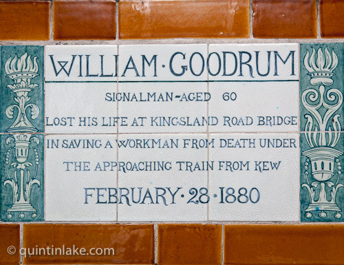 1905 tile by William De Morgam "William Goodrum Signalman · Aged 60 Lost his life at Kingsland Road Bridge in saving a workman from death under the approaching train from Kew February 28 1880" (Photo: Quintin Lake)