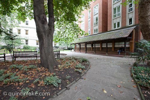 Postman’s Park is hidden away park in central London, a short distance north of St Paul’s Cathedral. Bordered by Little Britain, Aldersgate Street, King Edward Street, and the site of the former head office of the General Post Office (GPO), it is one of the largest parks in the City of London, the walled city which gives its name to modern London. A shortage of space for burials in London meant that corpses were often laid on the ground and covered over with soil instead of being buried, and thus Postman’s Park, built on the site of former burial grounds, is significantly elevated above the streets which surround it. It is best known as the location of the Memorial to Heroic Self Sacrifice.