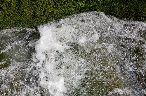 Bubbling water rushes by moss at the the mill race at Skinner's Mill, Painswick
