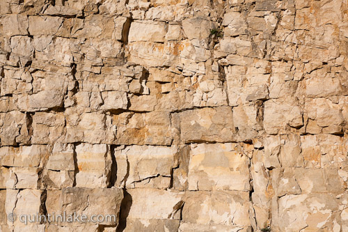 Detail of rock strata at old limestone quarry workings at Leckhampton Hill, Cheltenham, Gloucestershire