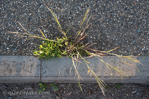 Grass explodes into life next to the curb stone of the A435 by the road at Seven Springs, Gloucestershire