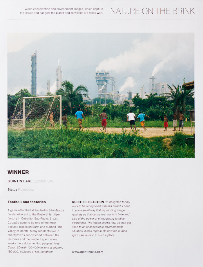 The image depicts a game of football game at Jardim São Marcos favela adjacent to the Fosfertil fertiliser factory, Cubatão, Sao Paulo, Brazil. Cubatao, used to be one of the most polluted places on earth dubbed “The Valley of Death”. Many residents live in shanty towns sandwiched between the factories and the jungle. I spent a few weeks with a non-commercial film crew documenting those lives of those who live there. My account of the experience can be read in  Cubatao: Life in the Valley of Death