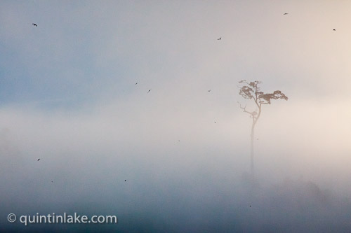 Birds fly over a lone rainforest tree by Kinabatangan River, Sabah
