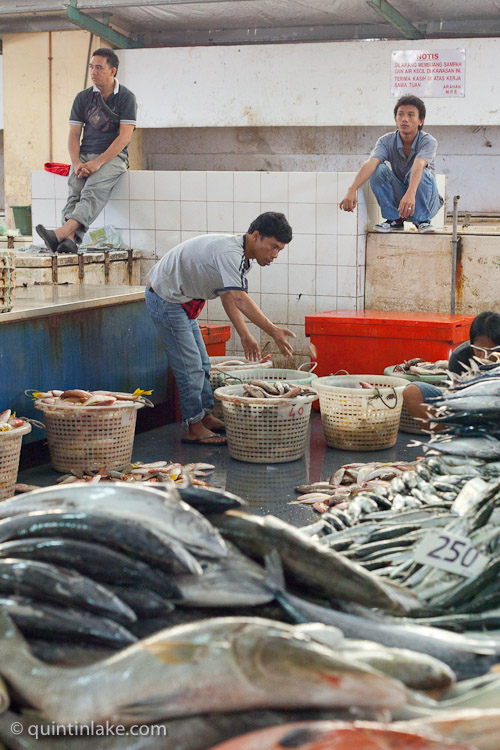Men working in the fish market in Sandakan, Sabah, Borneo