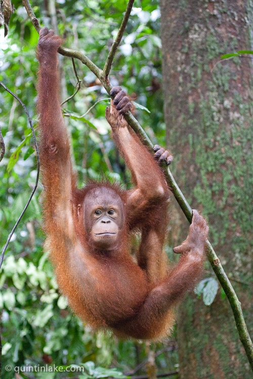 Young Bornean Orangutan, Pongo pygmaeus morio, hanging from a branch