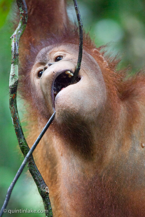 Portrait of Young Bornean Orangutan biting a twig, Sepilok, Sabah