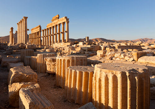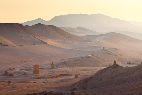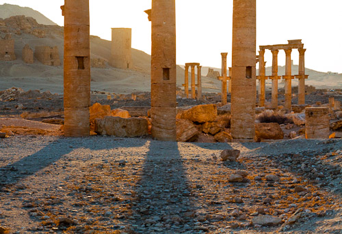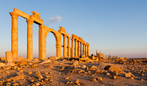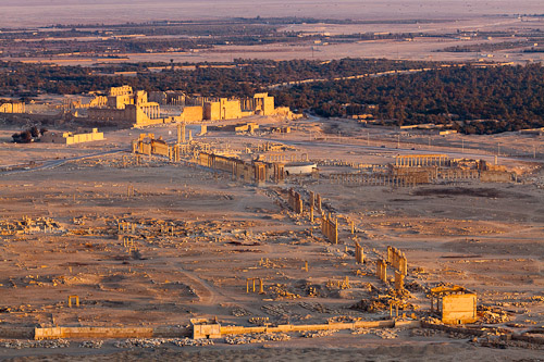 Overview of Palmyra at sunset showing the Great Colonnade running from the Funerary Temple in the foreground to the Temple of Bel at rear. Photo: Quintin Lake