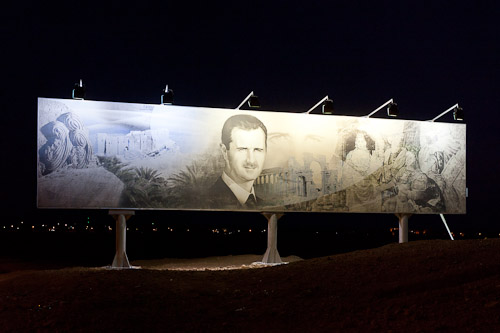 Roadside poster of Bashar al-Assad, president of Syria, February 2011 depicted with the ruins of Palmyra. Photo: Quintin Lake