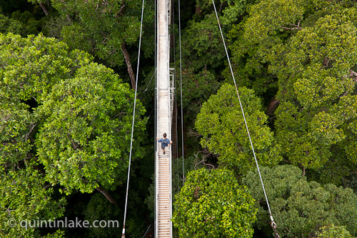 Aerial view man walks along the 50 metre high Canopy Walkway in Ulu Temburong National Park, Brunei